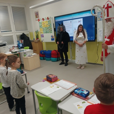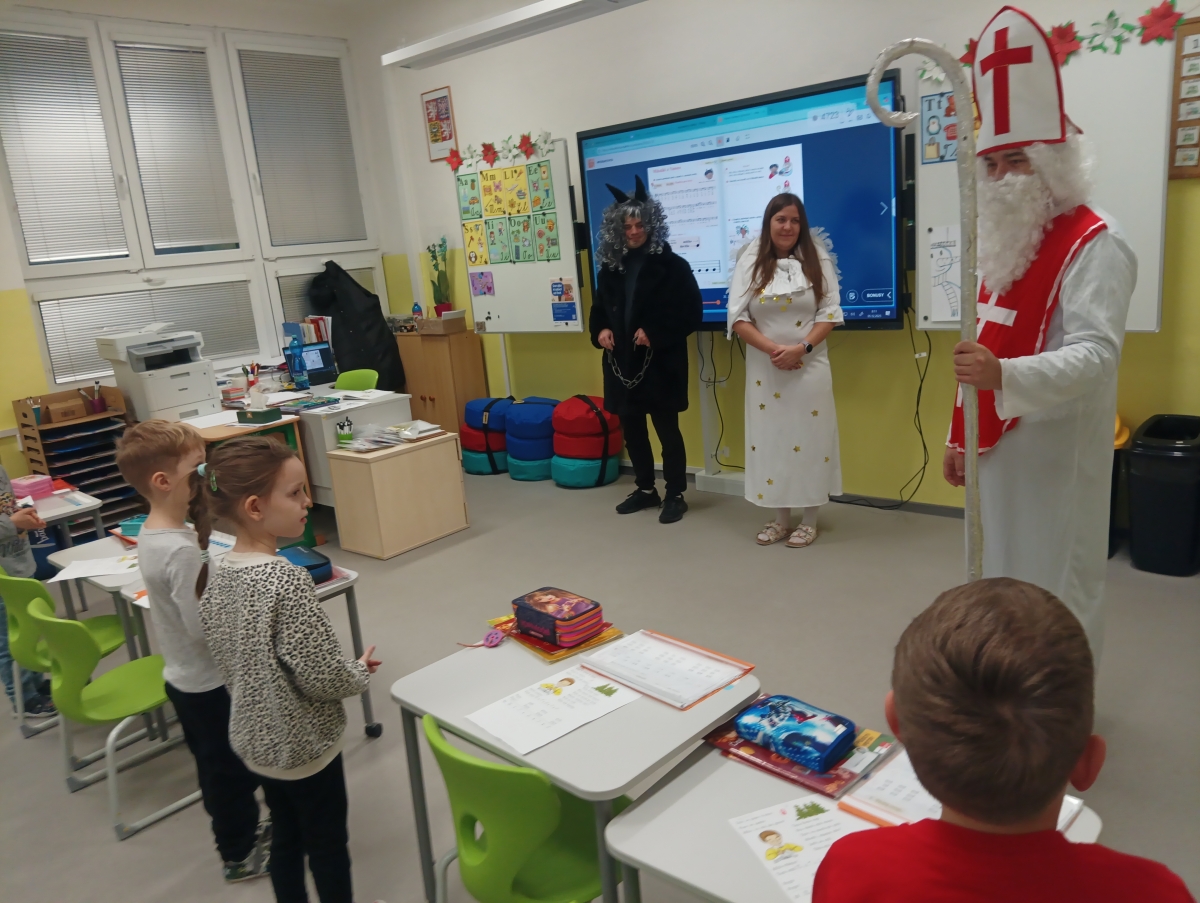 Zastavil se také za dětmi z 1. A, které si pro něj připravily krátkou písničku. Za své milé vystoupení dostaly od Mikuláše malé překvapení.